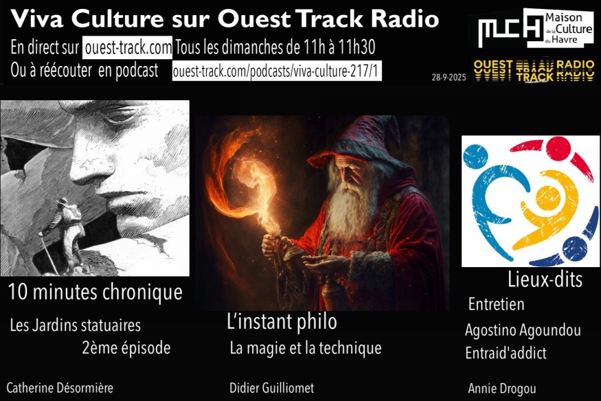 Émission du dimanche 28 septembre 2025 L'instant philo : La magie et la technique par Didier Guilliomet 10 minutes chronique : Les jardins statuaires #2, par Catherine Désormière Lieux- dits: entretien avec Agostino Agoundou, Entraid'addict, par Annie Drogou