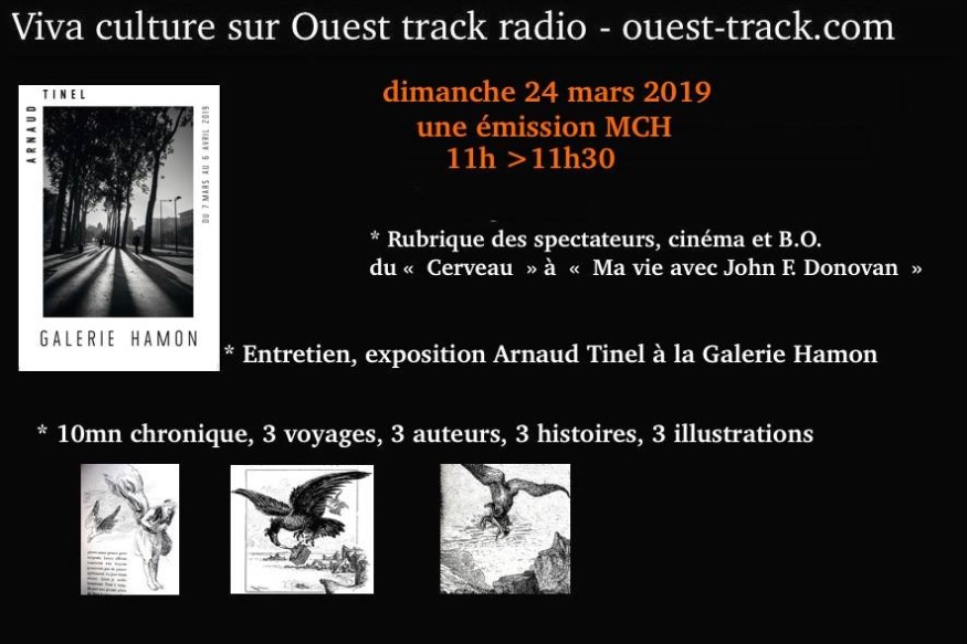 ENTRETIEN AVEC ARNAUD TINEL POUR SON EXPOSITION A LA GALERIE HAMON RUBRIQUE DU SPECTATEUR :CINEMA ET B O DU CERVEAU A MA VIE AVEC JOHN DONOVAN LES LIEUX DITS : ALICE BAUDE POETESSE DE RUE 10' CHRONIQUE : 3 VOYAGES , 3 AUTEURS , 3 HISTOIRES , 3 ILLUSTRATIONS ENTRETIEN AVEC GHISLAINE CHASTANET POUR LE FESTIVAL DU THEATRE AMATEUR DU 29 AU 31 MARS