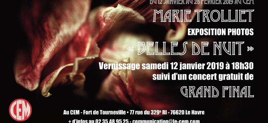 Le CEM accueille du 12 janvier au 28 février 2019, les « Belles de nuit » de Marie Trolliet, artiste photographe très étonnante, travaillant en macro et en argentique au cœur de la nature, d’une manière tout à fait inédite.Née le jour le plus court de l'année, en 1973, au Pays Basque où elle a vécu pendant 26 ans, Marie Trolliet est une vraie personnalité. Ne vous fiez pas à la frêle silhouette adolescente de cette brunette aux yeux rieurs et au sourire ravageur, c’est une femme de caractère qui se cache derrière cette apparence. C’est surtout une femme de grand talent.Arrivée à Paris en 2000, c’est ici qu’elle démarre sa carrière photographique. Autodidacte, elle n’a jamais cessé depuis de rechercher, d’essayer, d’interroger, de progresser. Son truc à elle, ce sont les paysages, les portraits, les natures mortes. « Vivant dans la grande ville, j'ai cherché et trouvé mon équilibre dans la nature, commente l’artiste. Nature que je photographie toujours, dès que je peux. »La série « Belles de nuit » est née de ces voyages et immersions dans la nature. De vrais périples envisagés avec méthode. Marie ne prend pas la nature avec elle ; elle se laisse prendre par la nature, se contorsionne « jusqu’à m’en couper le souffle » pour être au plus près de l’essence même de cette dernière, avec tout le respect, l’amour, qu’elle lui témoigne. « Et avec le désir de montrer la beauté des changements, des métamorphoses, de l'évolution, en couleur. Parallèle inconscient avec mes propres bouleversements intérieurs. »Perfectionniste jusqu’au bout de l’objectif, Marie travaille en macro et en argentique et le résultat est tout simplement bluffant : des fleurs comme autant de personnages dont on devine la moindre substance, le moindre filament organique, la plus petite des failles, la plus grande des splendeurs. Des décrépitudes sublimées, colorées, odorantes. Des tissus floraux de velours, de perle et de soie. On frôle ici le sublime. De fait, si photographier lui coupe « son » souffle, regarder ses photos coupera le vôtre.On notera que Marie Trolliet a réalisé toutes les photos florales du coffret 4 vinyles de Grand Final intitulé « La Mort ». Il était normal que le duo havrais emmené par Doris et Jean-François Thieulen lui offre à son tour, un joli bouquet de lumière et de décibels, en proposant un concert en entrée libre lors du vernissage de cette exposition accueillie par Le CEM.