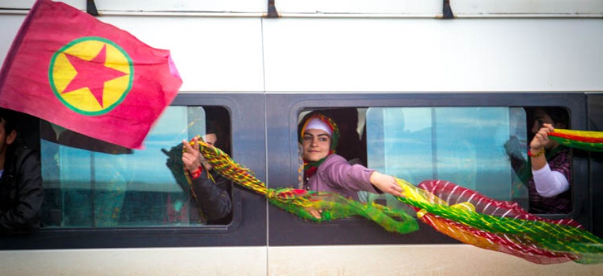 Femmes brandissant drapeau et foulard kurdes à la fenêtre d'un bus. Auteur : Sunrise Odyssey (wikimedia commons)