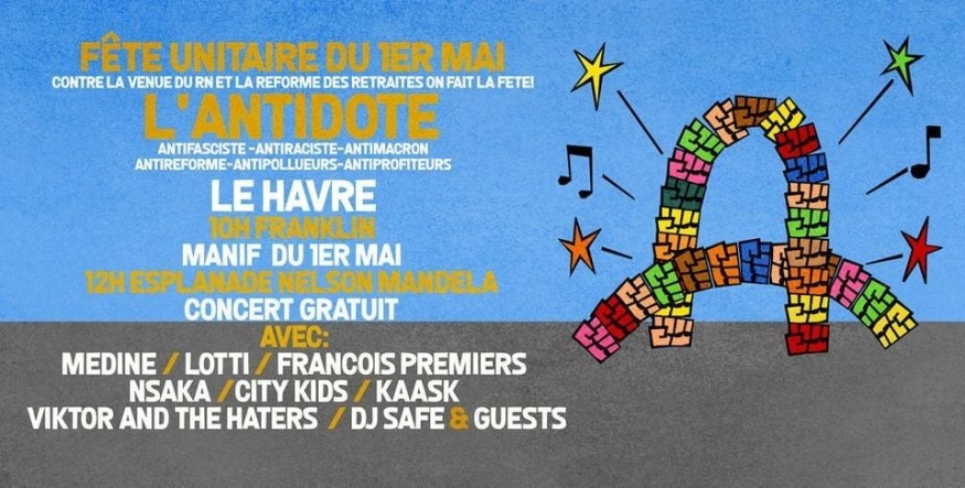 Les associations Le havre de grève, Solidaires Le Havre et Nous toutes 76, ont alors organiser la manifestation annuelle partant du cours de la république, suivie d'un village millitant et festif avec une scène pour des concerts gratuits d'artistes havrais comme Médine, Lotti, François premiers, City kids, Kaask, Viktor and the haters, Nsaka et DJ Safe sur l'esplanade Nelson Mandela, c'est à dire à la catène de conteneur, de 12h à 18h. L'évènement avait pour nom l'Antidote: c'était un évènement comme un remède, je cite : "antifaciste, antiraciste, anti-macron, anti-réforme, anti-pollueur, anti-profiteurs".