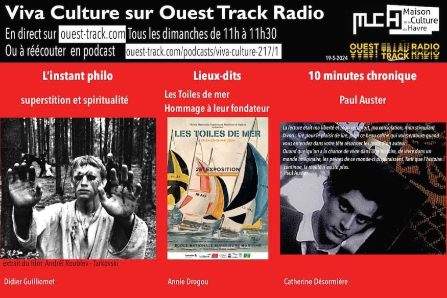 INSTANT PHILO : religion, superstition, spiritualité10 MN CHRONIQUE Paul AusterLIEUX DITS Les toiles de merAU REVOIR Agenda : exposition à l'abbaye de Graville Elégance + concert église Ste Marie, choeur Impressions, E. Falala, 5 juin 20h30