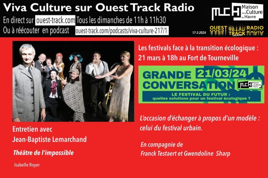 ENTRETIEN / JEAN BAPTISTE LEMARCHAND, le Théâtre de l’impossible MUSIQUE / REMI DACHEUX BLACK SAND AU REVOIR Agenda culturel : 1/ Grande conversation 21 mars 18h, La Halle, Fort de Tourneville : Avec Franck Testaert, qui organise chaque automne depuis 20 ans Ouest park, un des festivals les plus courus de notre agglomération, et Gwendolenn Sharp, fondatrice et coordinatrice de l’agence The Green Room, spécialiste de la transition écologique dans le monde de la culture et du spectacle vivant. 2/ Exposition IMAZIGHEN, Berbères du 18 mars eu 18 mai à l’atrium de la bibliothèque universitaire...