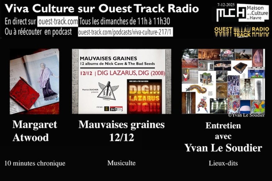Programme de l'émission du dimanche 07 décembre 2025 : MUSICULTE : Nick Cave 12/12 Dig Lazarus par Patrick Ducher 10 MN CHRONIQUE : Margaret Atwood, par Catherine Désormière LIEU DIT : Yvan Le Soudier, plasticien, voyageur par Annie Drogou AGENDA : Festival Le Goût des autres du 15 au 18 janvier 26 (Isabelle Royer)