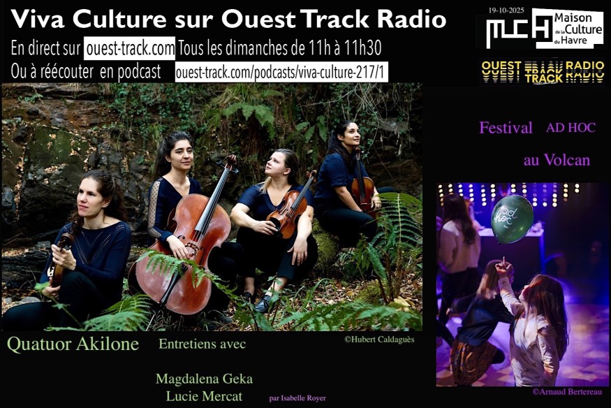 Programme de l'émission du dimanche 19 octobre 2025 : Interview : "Festival Ad Hoc" au Volcan du 29 novembre au 6 décembre 2025, Benjamin, Marc-Antoine Retrel et Sylvain Vasse (Isabelle Royer) Musique : JOAQUIN TURINA Miniaturas, Op. 52: I. Caminando (Walking) Jordi Maso Viva sur scène : Quatuor Akilone : Magdalena Geka (violon1), Lucie Mercat (violoncelle), Association Résonances : concert "Scènes espagnoles" le 12 octobre 2025 au THV, Manuel Vioque Judde (artiste associé)
