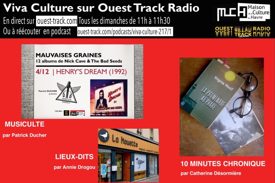 MUSICULTE : Mauvaises graines -Nick Cave - 4ème épisode Henry's dream - 1992 - Patrick Ducher 10 MN CHRONIQUE : Un petit tour littéraire du côté de Virginia Woolf : Lire ou relire La promenade au phare, publié en 1927- Catherine Désormière LIEU DIT La mouette, association coopérative - Annie Drogou AU REVOIR Agenda : Punk[.]e[.]s au THV 23 avril 20h