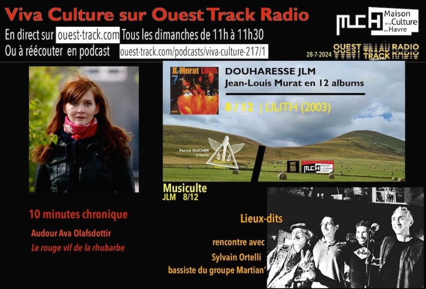 Musiculte : Jean Louis Murat, 8ème épisode:"Lilith"10 mn chronique : "Le rouge vif de la rhubarbe", Audour Ava OlafsdottirLieux-dits : rencontre avec Sylvain Ortelli, bassiste du groupe Martian’sAu revoir Agenda le Charivarium de la compagnie Les nuits vertes